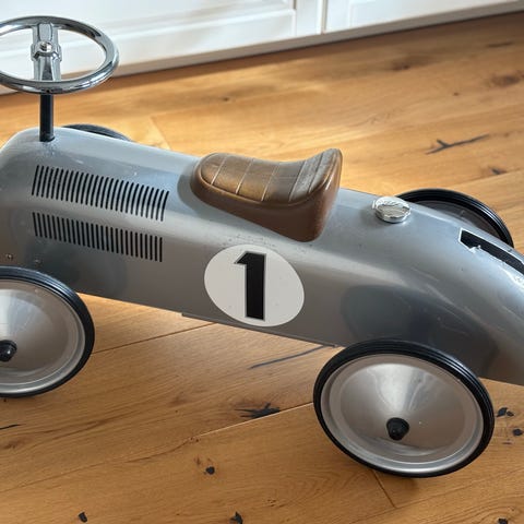 Säljer en ljusrosa retro sparkbil i plåt från STOY. Den är lättstyrd med gummidäck. Passar barn från 2 år. Sparsamt använd.