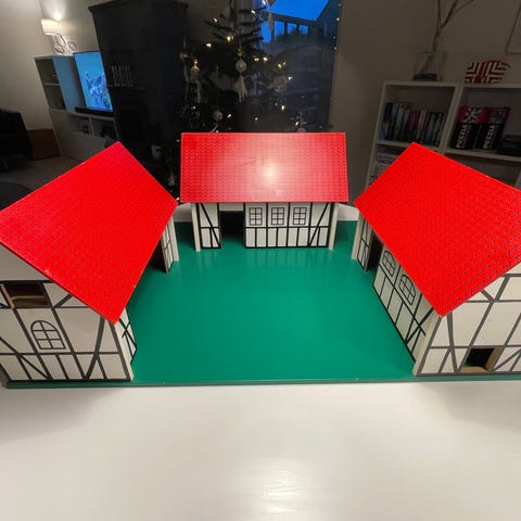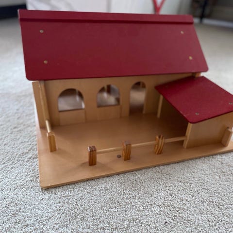 Fin bondgård i trä som består av hus och två stallar med avtagbara tak samt tillhörande bottenplattor 60x44. Ett fint set - perfekt julklapp. Aldrig använt. Nypris 550kr utan tillbehör så som djur och traktor.