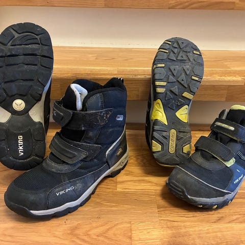 Hela förutom längst fram på ena skon där tyget har lossnat. Går att täcka över med en laglapp.