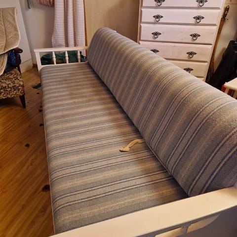 Bäddsoffa som är framåtbäddad. Mått soffa: längd 195 cm, djup 90 cm och höjd 75 cm. Sängbotten med träribbor mått utbäddad: 160 cm bred ca 200 cm lång.