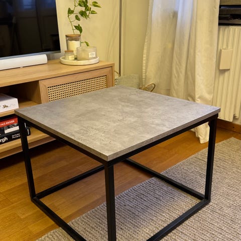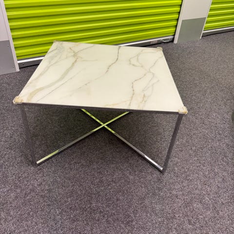 Soffbord med kvadratisk form och bordsskiva i vit marmor. Underrede i svart metall med rektangulär design. Mått: 75x75 cm. Passar som vardagsrumsbord eller sidobord.