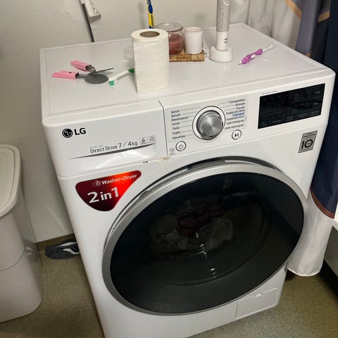 Logik kombinerad tvättmaskin och torktumlare. Vit färg med frontmatning och elektronisk kontrollpanel med vred och display. Maskinen är avsedd för tvätt och torkning i ett och samma enhet.