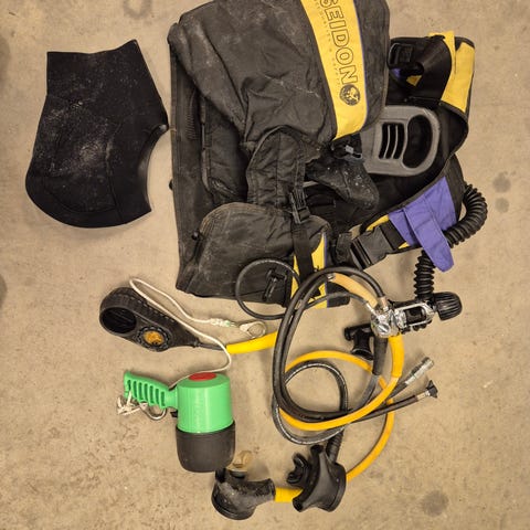 Dykutrustning inklusive fenor, snorkel, dykmask och våtdräktskor.