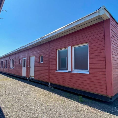Sjöcontainer 40fot, stor dörr i ena ändan, öppning med egengjord dörr i mitten på långsidan, viss inredning som hyllor.