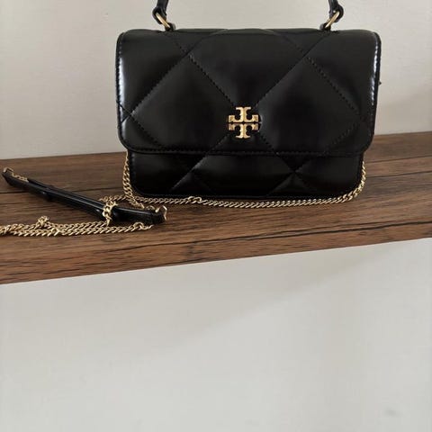 Tory Burch handväska tillverkad i läder, avsedd för kvinna. Väskan har en quiltad design och är utrustad med en kedjestrap för bärning. Insidan innehåller ett fack med dragkedja för förvaring av mindre föremål. Köpt 2022 i färgen gray heron.