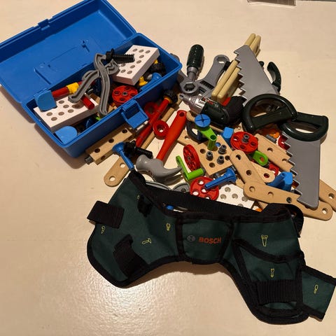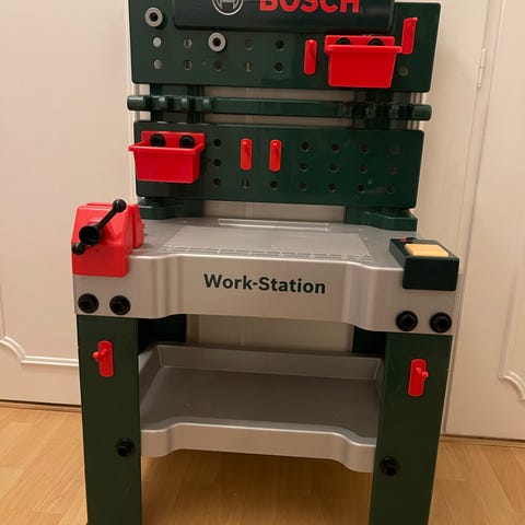 Bosch Work Shop lekverktygset för barn med olika verktyg och tillbehör. Innehåller en arbetsbänk och verktygsväska med redskap som såg, skruvmejslar, tänger och mycket mer.