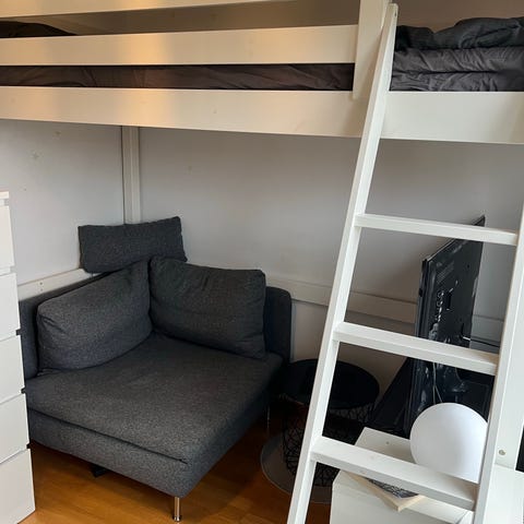 Säler min platsbyggda loftsäng, den finns på Kungsholmen och kan monteras ner av snickaren som byggt den för extra 800 kr
