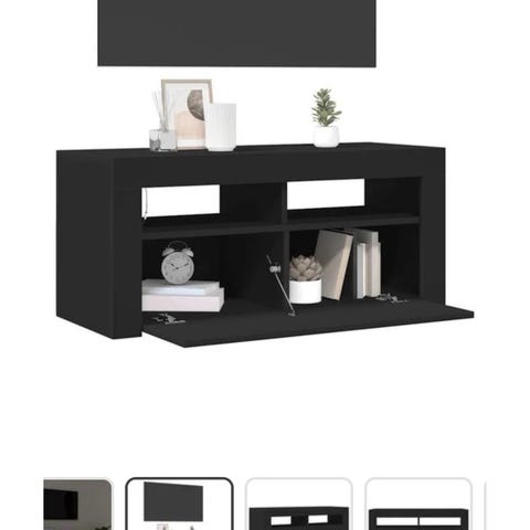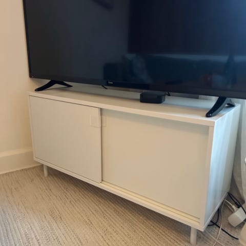 Musik-/media byrå på hjul. Grå m mörkt grå donat glas dörr med magnetstopp. Öppen baksida för sladdkopplingar.