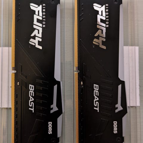 Detta är 32GB av kingston Fury beast DDR5 ram minne för datorer. Dom lyser med RGB lysen när datorn sätts på. Det kommer i förpackning av 2 och det är 16GB ram på varje.