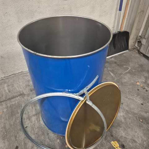 Två tunnor i plåt med lock, användbara för förvaring eller avfallshantering. Behållarna har handtag på locket och är slitna med synliga tecken på användning.