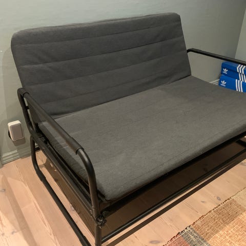 IKEA bäddsoffa med svart klädsel och metallram. Soffan kan fällas ut till en säng och har måtten 128 cm i bredd, 70 cm i djup och 79 cm i höjd som soffa. Som säng är den 190 cm lång och 120 cm bred. Passar för användning som både sittplats och tillfällig sovplats.
