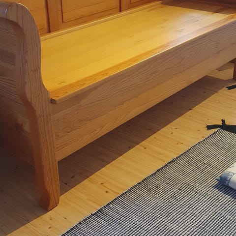 Karl Johan-soffa, även känd som Biedermeier-soffa, i mahognyfanér. Klädd i tyg från Växbo Lin. Kan användas som säng/förvaring under sofflocket, utdragbar underdel.