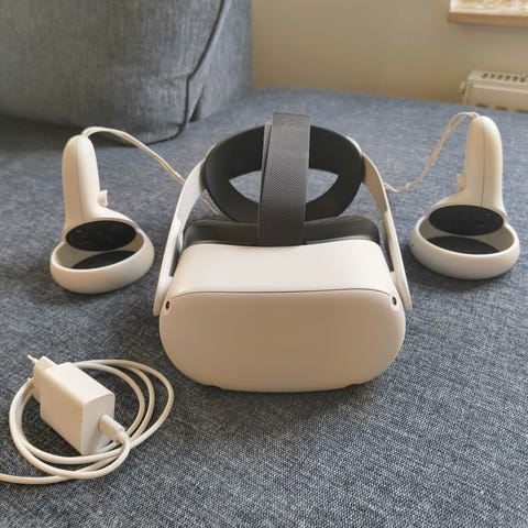 Oculus Quest 2 VR-headset inklusive två handkontroller. Helt i vitt med justerbara remmar för bekväm passform. Används för virtuell verklighet och spelupplevelser.