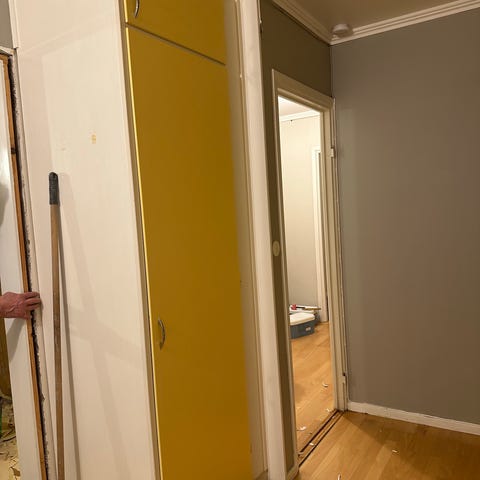 Stort kök med mycket luckor och en diskbänk i rostfritt stål i väldigt fint skick. Stommarna är från då byggnaden uppfördes på 80-talet. Köksluckorna är bytta en gång sedan det byggdes. Kylskåpsväggen Har rymt dubbel kyl och frys för standardmått på 60 cm. Ett mycket rymligt städskåp till vänster om det.