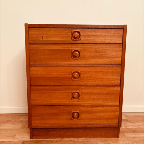 Jag tycker att det här skåpet såldes som teak, så materialet är oklart. Något skillnaden mellan det andra skåpet jag säljer via blocket.