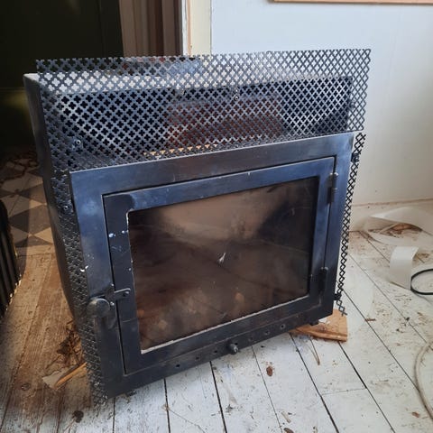 Plåt med klöverformade hål för sidor medföljer, samt skorstensrör och ett gallerinlägg för veden.
