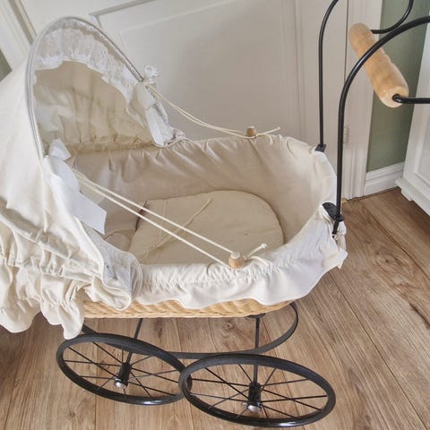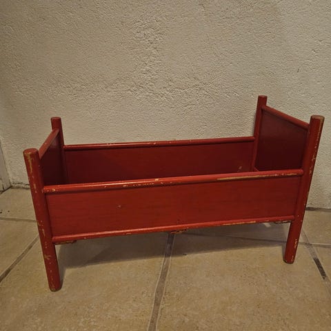 Superfin gammal docksäng på hjul. Skickar med dockan och täcket om man vill. Skrållanklänning men inte en äkta skrållandocka.