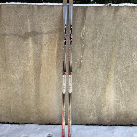 Fisher längdskidor med tillhörande stavar och pjäxor. Skidorna har bindningar (NNN) för längdskidåkning. Stavarna är utrustade med handtag och remmar för bättre grepp.