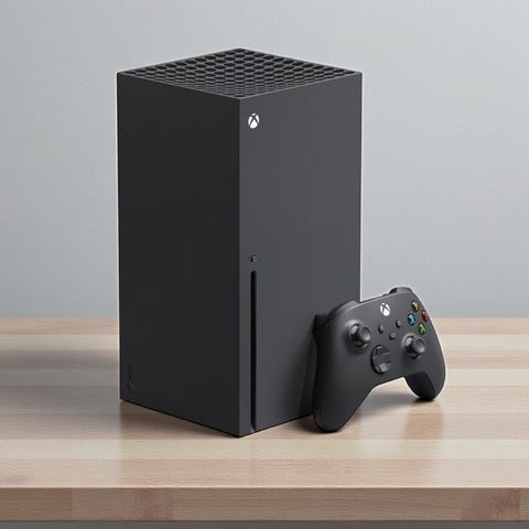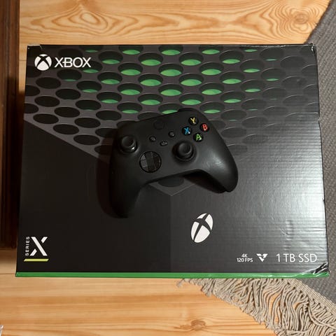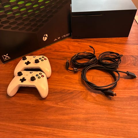 Xbox Series Xbox Series X spelkonsol inklusive två trådlösa handkontroller i svart och vitt. Konsolen är designad för att spela Xbox Series-spel och har en vertikal, svart design med ventilationshål på toppen.