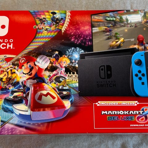 Nintendo Switch spelkonsol med Joy-Con-kontroller i röd och blå färg. Konsolen levereras med originalförpackning och tillbehör inklusive laddningsstation och strömadapter. Passar för bärbart och stationärt spelande.