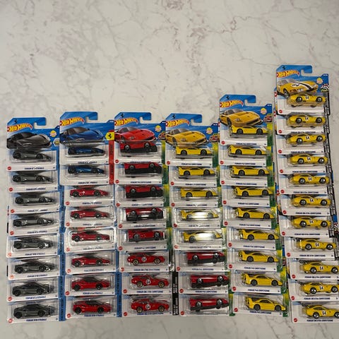 Hot Wheels samling i originalförpackning. Bilarna är i olika modeller och färger, avsedda för samlare eller leksaksbruk.