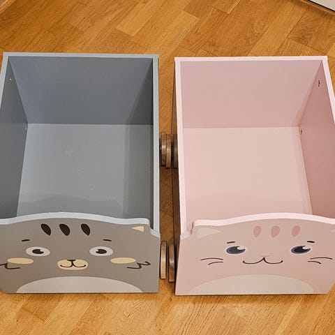 Två orange metallkrokar med kattmotiv. Varje krok har en krokformad upphängningsdel och är utformad för att hänga upp lättare föremål.