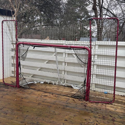 Ishockeymål med nät och ram i röd färg. Används för ishockeyspel och träning.