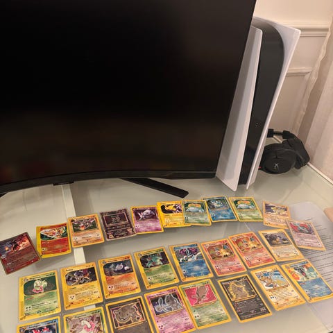 Samling av Pokémon samlarkort med olika karaktärer och typer. Kort i varierande skick och är från Base set. Innehåller både Pokémon, tränarkort och energikort. Passar för samlare och spelare.