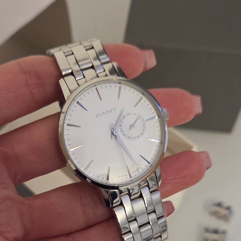 Gant unisex klocka med stållänk och svart urtavla. Klockan har datumvisning och en rund boett i metall.