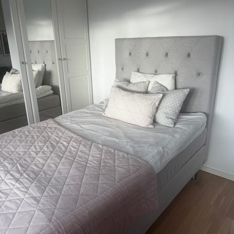 Säng Ikea Stavanger antracit 120 cm i finfint skick med ben i björk och bäddmadrass Sauland 7 cm med havererad dragkedja efter tvätt. 4 år gamla. Nypris ca 7500 kr. Sängen har ett 50 cm solblekt stråk, se bild (syns ej under bäddmadrass). Bäddmadrassen skickar vi med.