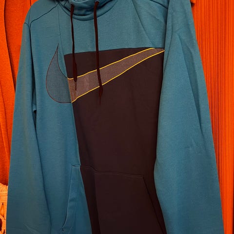 Nike Flerfärgad Luvtröja i marinblå och gröna toner med svart dragkedja.