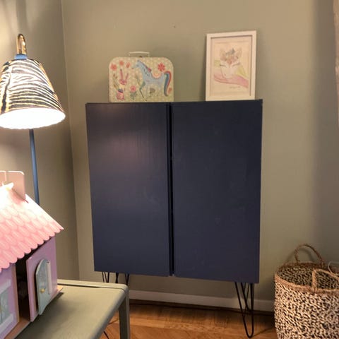 Betsat IVAR skåp från IKEA med ben. Mörk färg men träts egenskaper lyser fortfarande igenom. 4st svarta metallben (11cm höga) sitter på under sidan av skåpet.
