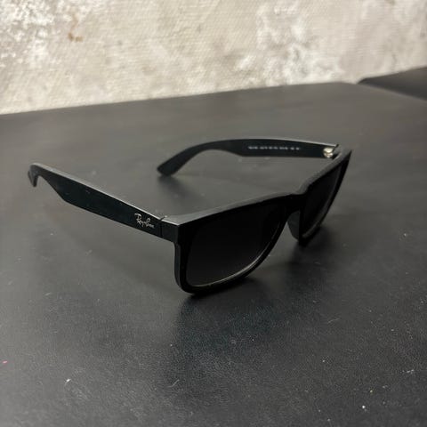 Ray-Ban Justin är en riktigt cool look som är inspirerande av Wayfarer modellen. Justin har något större och mer rektangulära glas och en gummi liknande finish på bågen. Dessa är i snygg svart båge och grå gradual färgade glas. Ray Ban solglasögon står för kvalitet och klassiska. De är i fint skick (bruksslitage och text på skalm delvis borta).