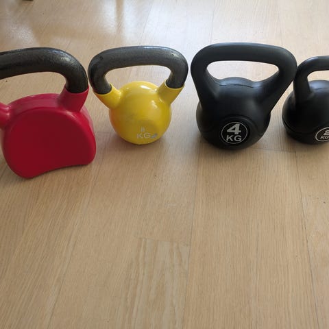 Kettlebell med vikt på 12 kg, lila färg och svart handtag. Tillverkad i metall med beläggning för greppvänlighet. Används för styrketräning och funktionell träning.