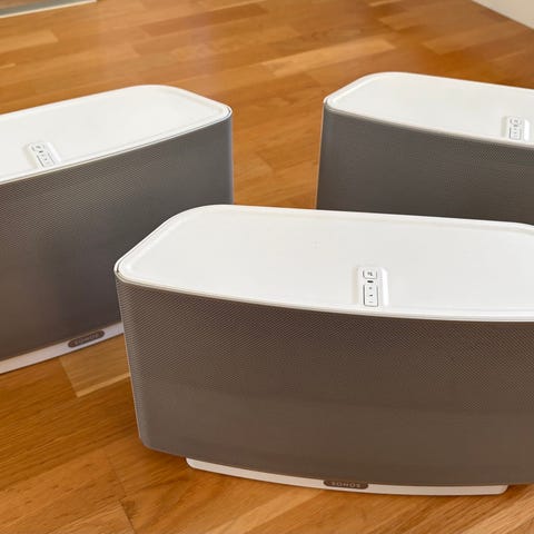Sonos högtalare i vit färg. Utrustad med anslutningar för ljudingång och nätverk. Designad för inomhusbruk med modern och kompakt form.
