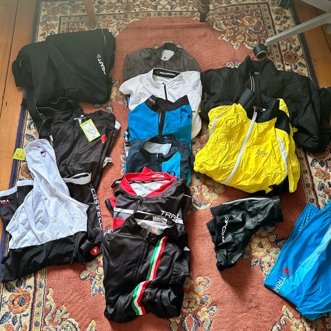 Bla Specialized cykelkläder och cykelskor sidi och specialized. Jag har stl 40 men skorna små så stl 41- 42, hjälm team rynkeby, cykeltröjor i Craft och annat.