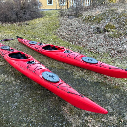 Två nästan nyaTahe Marine kajaker. 390 cmm och 450 cm längd. Paddel, sittbrunnskappell,våtdräkt L, Kajakhållare och flytväst ingår. Pris 9000 kr. st. eller 18000 kr. för båda.