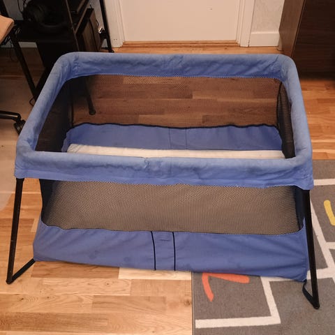 Babybjörn resesäng inkl madrass i mycket gott skick. Sparsamt använd. Jag kan inte hitta några fläckar (bara damm 😅). Allt tyg går att tvätta. Smidig upp- och nedfällning och tar lite plats vid förvaring.