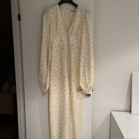 Oanvänd klänning från House of Dagmar. Klänningen har en v-ringad hals med knytning och långa ärmar med detalj i ärmslut. Lätt utsvängd modell som ger klänningen ett fint fall.