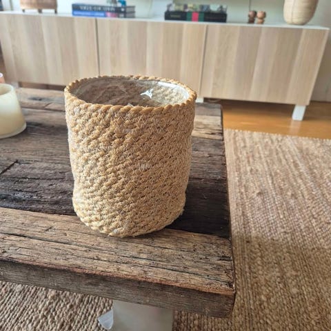 Set bestående av tre krukor i keramik med dekorativt mönster i jordnära färger. Varje kruka har rund form och varierande storlek, lämpliga för inomhusbruk.