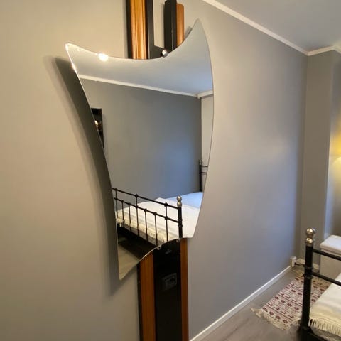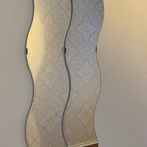 2 st IKEA spegel med vågig form modellen Krabb. Spegeln böljande kanter och är avsedd för väggmontering. Vägfästen ingår. Höjd 160 cm och varje spegel är 20 cm bred. Skickas inte.