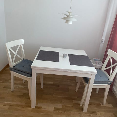 Matbord 175*95, höjd 74 cm som även har 2 st. iläggsskivor 40+40 cm. Stolar JISK från Jysk i fint skick med tillhörande dynor.