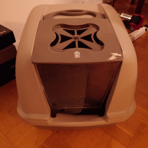 Kattlåda med tak. Finns 2 stycken. Blå eller beige nederdel. 100 kr/st.