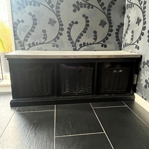 En fin bänk gjord i Dahlhem., med måtten längd 150, djup 31 och höjd 51 cm. Finns i Visby.