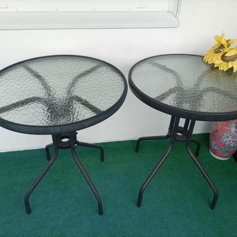 Två metallbord med glasöverdrag.