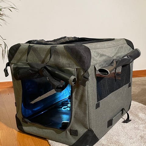 Transportbur i plast med metallgrind. Används för säker transport av husdjur. Har ventilationsöppningar på sidorna och ett låsbart galler fram. Lämplig för små till medelstora djur.