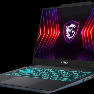 MSI gaminglaptop med RGB-belysning på tangentbord och kylplatta. Laptoppen har en svart design och är utrustad för spelanvändning med avancerad kylning för att hantera hög prestanda.