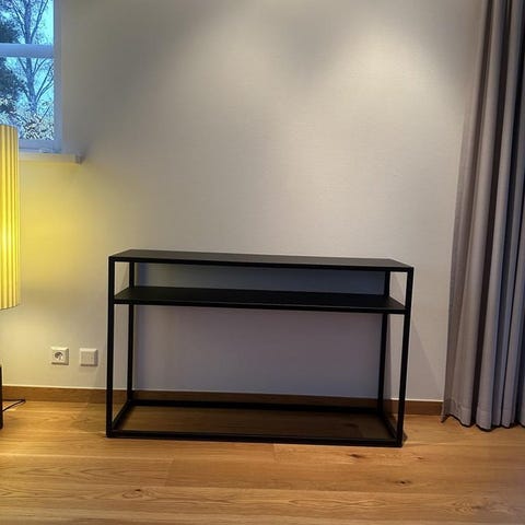 Elegant sidobord i en antikgrå färg. Bordet är nedmonterat, finns en skavank på framdelen (se bild). Nypris: 4995, inköpt på exklusiva OscarClothilde.