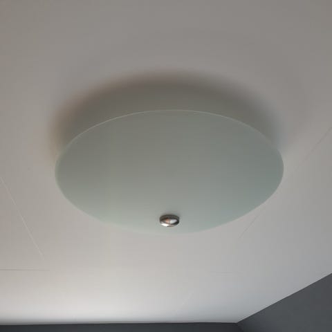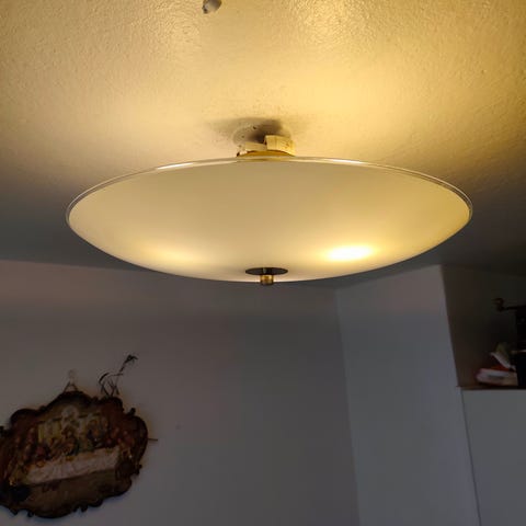 Plafond med en stomme i mässing och en stor skärm i vitt glas. Lampan har tre ljuskällor.