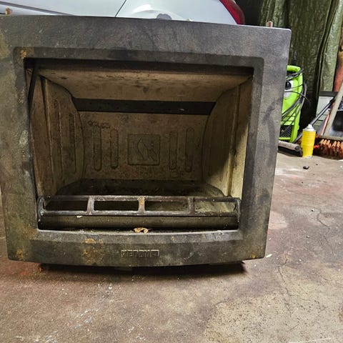 Insatskamin i gjutjärn Keddy med tillbehör såsom gjutjärnsrör, öppningshandtag i gjutjärn samt tre fötter i gjutjärn.